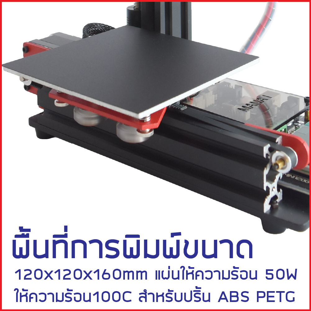 เครื่องพิมพ์ 3 มิติ ผลิตในประเทศไทย มานะ 1 ประกอบสำเร็จ โครงสร้างโหละ ขนาด 120x120x160mm ฐานความร้อน หัวฉีดตรง